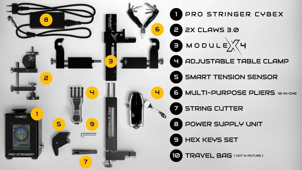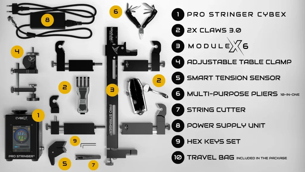 ModuleX6: XL Adjustable Table Clamp + Adjustable Mounting Post + 2x Rotation Main Racquet Bar + 1x Throat Cross Bar + 1x Head Cross Bar + 2x Racquet Support Swivel + 1x Flat Head Support + 1x K-Type Adapter + 1x Flat Adapter + 1x Flat Throat Adapter