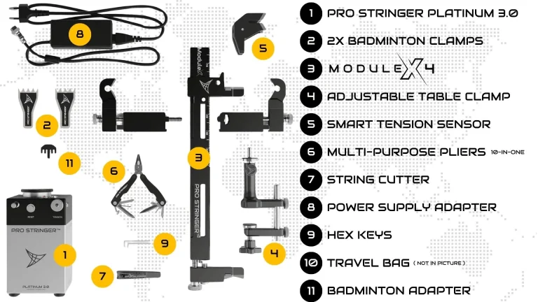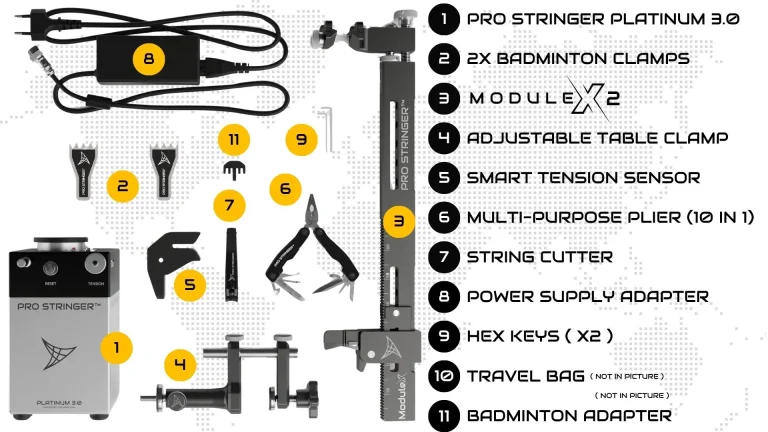 ModuleX4: XL Adjustable Table Clamp + Adjustable Mounting Post + 2x Rotation Main Racquet Bar + 1x Throat Cross Bar + 2x Racquet Support Swivel + 1x Flat Head Support + 1x K-Type Adapter + 1x Flat Throat Adapter